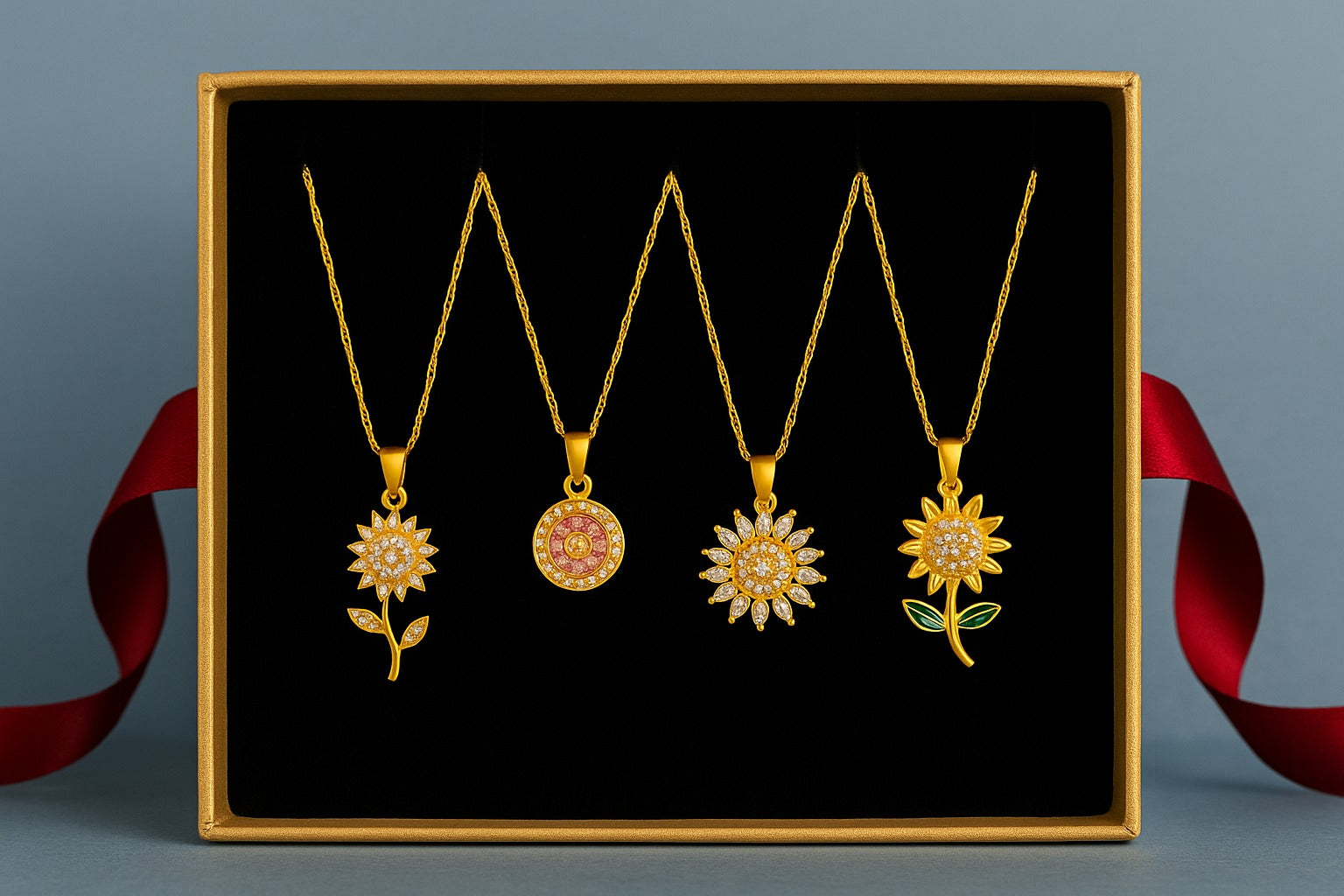 Incluye: Cadena con dije inspirado en los girasoles y motivos florales.
